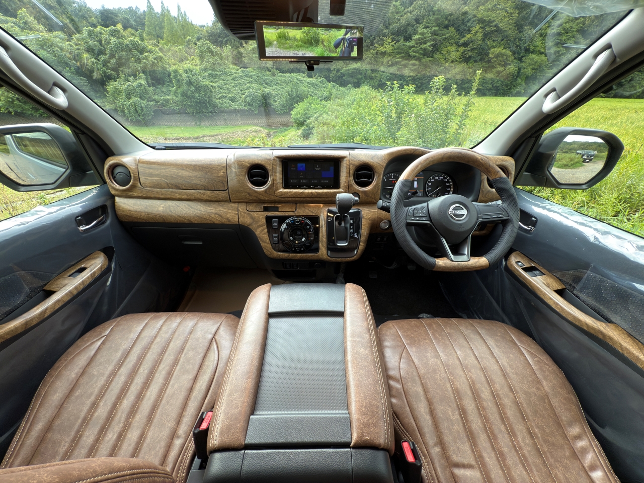 インテリアはシンプルで使いやすく、それでいてお洒落な造り☆リアルウッドで制作されたLEDダウンライトや木目調フローリングフロアなど『木』を感じながら車旅を楽しめるのも特徴の一つ♪