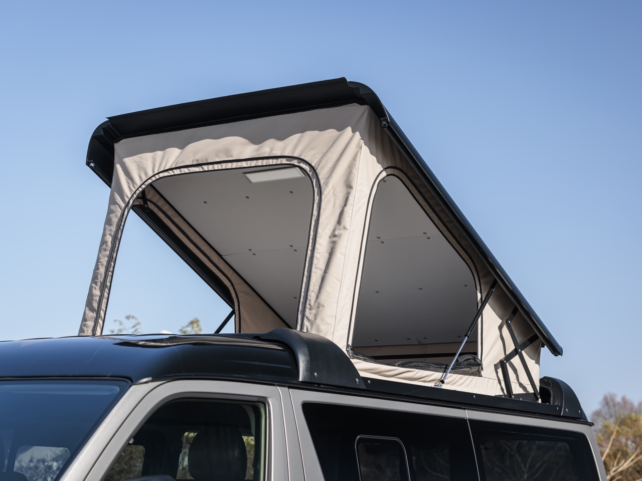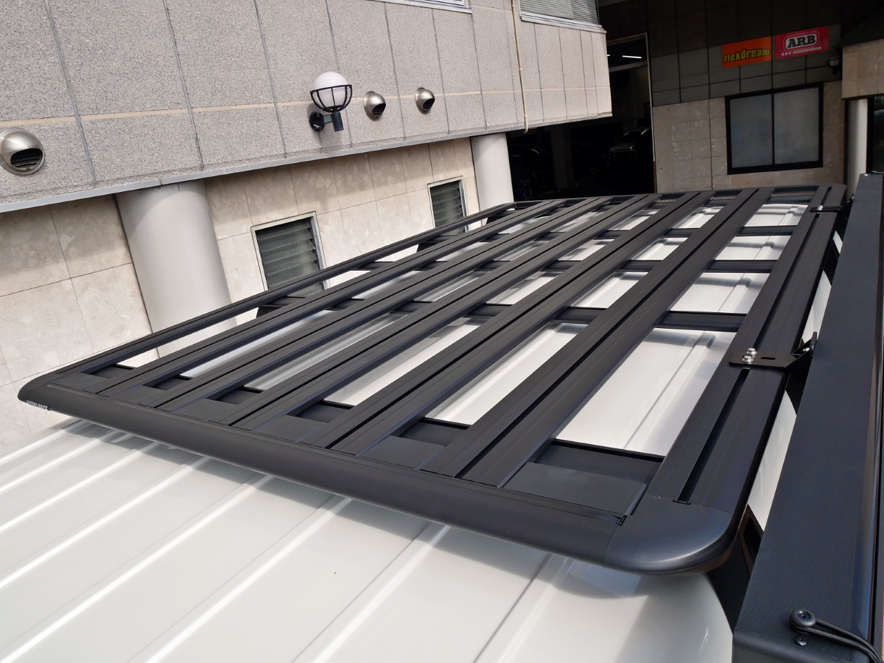エクステリアは丸目フェイスFD-classic、RHINO-RACK≪ルーフラック≫、ARB4x4:サイドオーニング、JAOS:フェンダーガーニッシュTypeX、GEOLANDAR:X-AT、BRUT:BR-00。