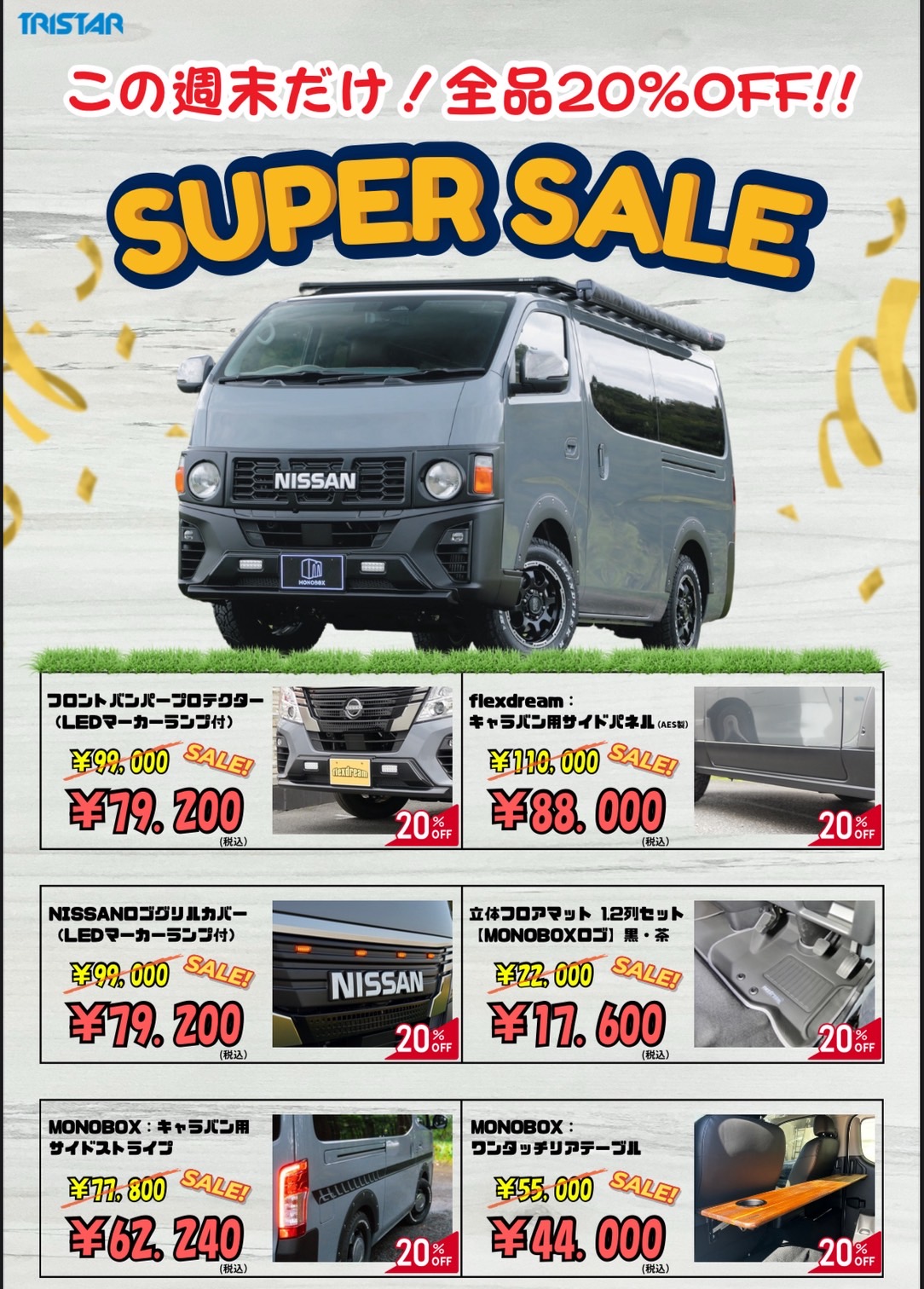 MONOBOXの人気パーツを会場限定特価☆20パーセントOFF☆にてご案内いたします♪展示してあるカスタムデモカーにも実際に装着されているパーツ/アイテムなので装着感をご覧いただけます♪