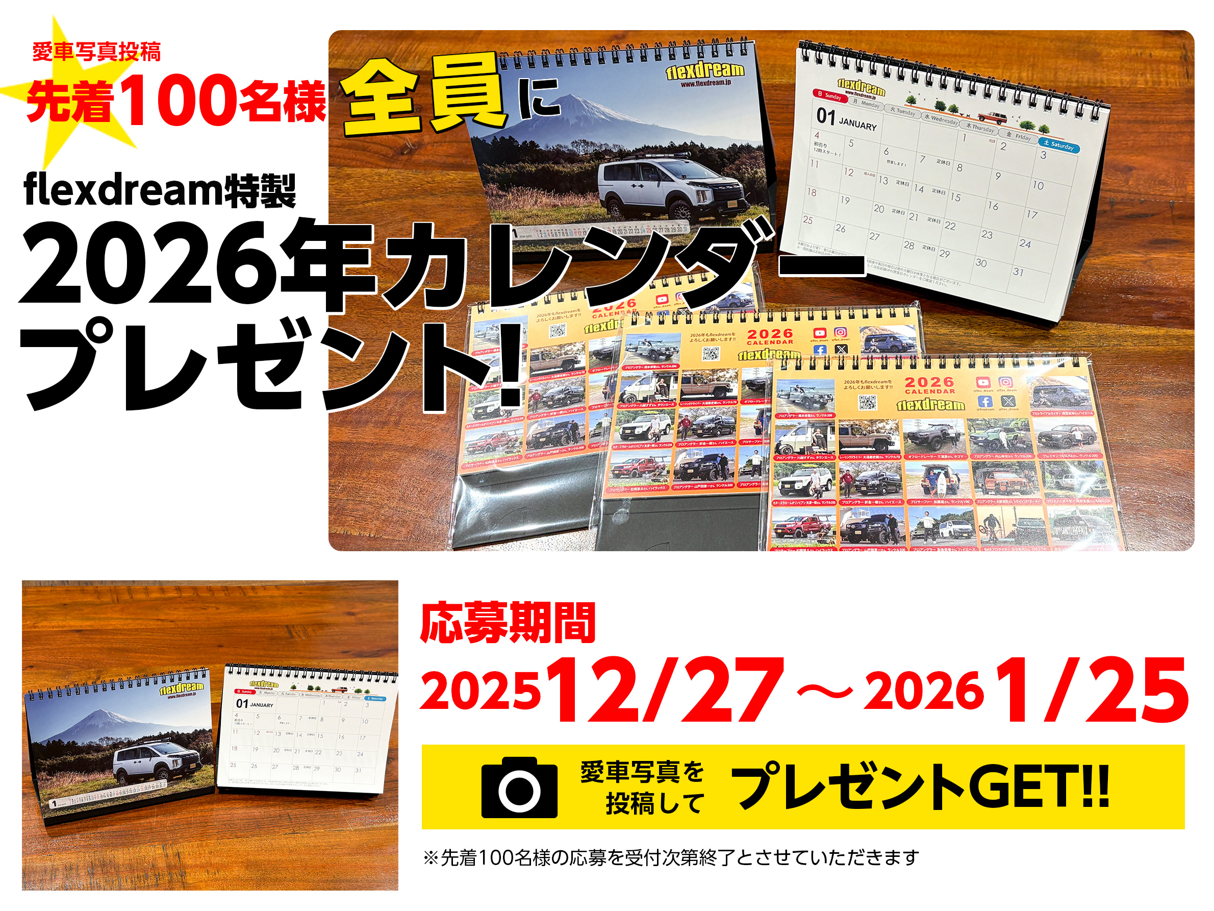 今年もとうとうこの季節がやってまいりました!あなたの愛車・相棒を自慢していただければ先着100名様全員に直接書き込んで使いやすいflexdreamオリジナル2026年特製卓上カレンダーをプレゼント!